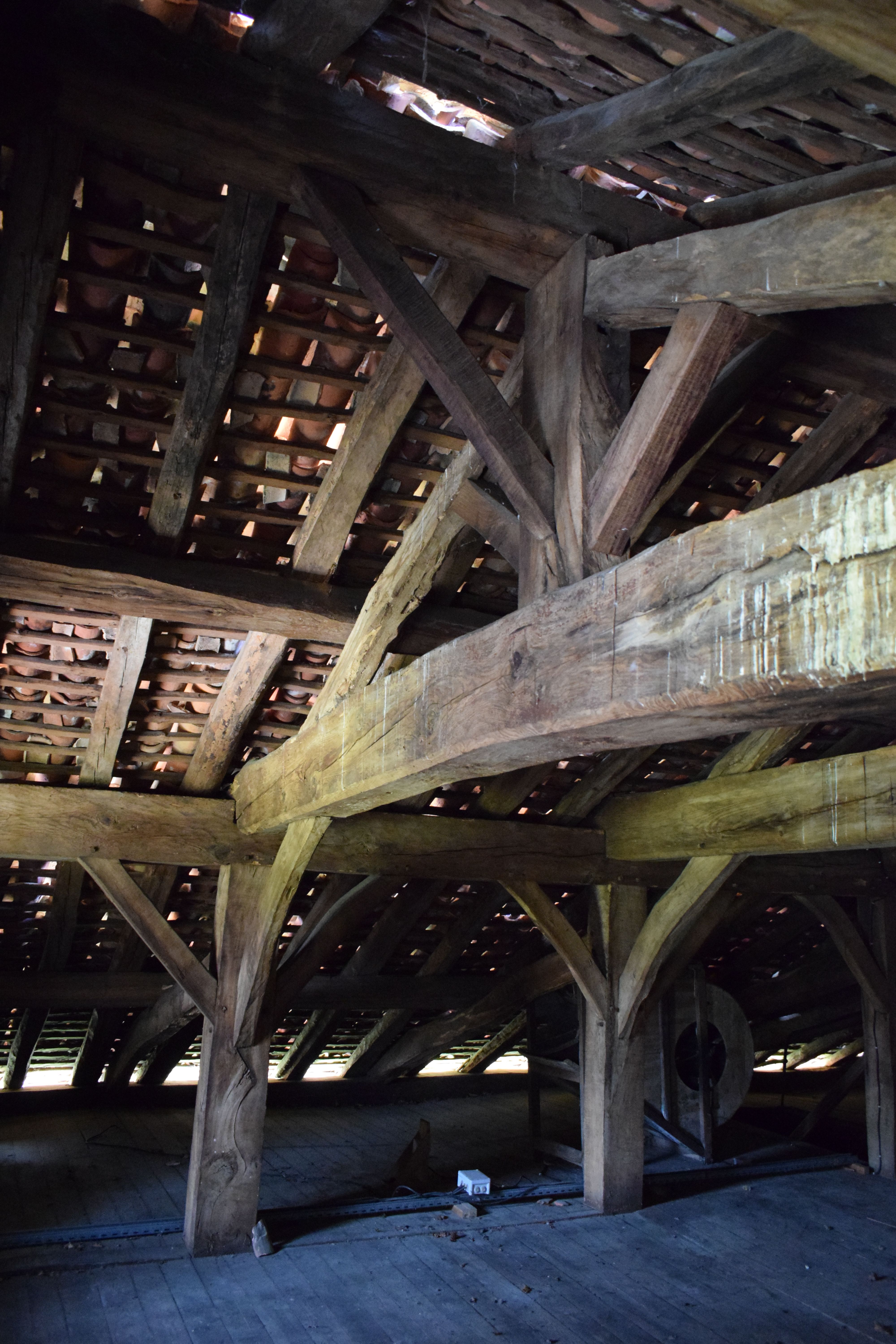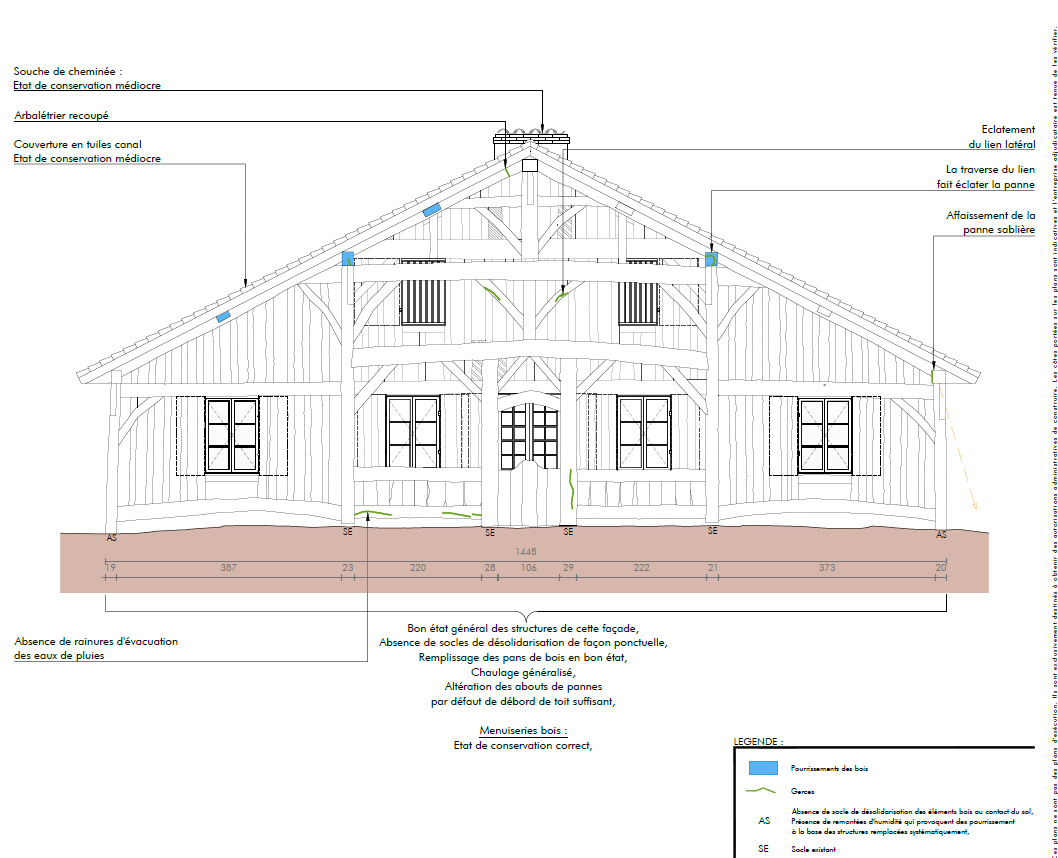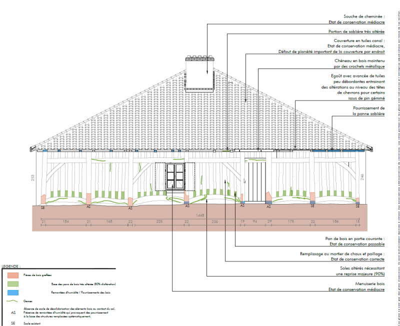 Ce rapport fait état d’importantes dégradations latentes. Les bois sont attaqués par des insectes xylophages et parfois des champignons. Les têtes de chevrons subissent le ruissellement des eaux de pluie depuis les avant-toits, tandis que certains bois de poteau reposent directement sur le sol et connaissent des remontées d’eau par capillarité. L’humidité a aussi provoqué l’affaissement vers l’intérieur de la façade nord. L'état sanitaire et parasitaire des bois structurels est donc alarmant et provoque des dégâts physiques sur la totalité des matériaux constitutifs du bâtiment ainsi que ses menuiseries.